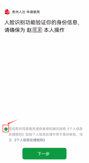 第四步,在人脸识别信息确认页面,需确认页面上显示的姓名是否本人,并点击勾选页面左下角的服务条款,勾选后即可点击“下一步”。