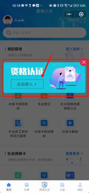 第一步,通过微信搜索进入“贵州人社”微信小程序,进入点击弹出的“资格认证”的图片。